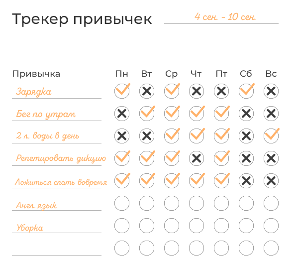 Например, если вы хотите развить привычку написания книги, ваш трекер может выглядеть следующим образом: